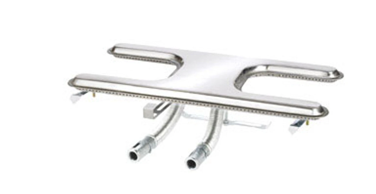 16 in. stainless steel “H” burner with 2 flexible venturis. Improved design, with fully sealed left/right sections. Venturis can be center mounted or mounted up front, for better universal fit. Includes universal mounting hardware with adjustable feet.