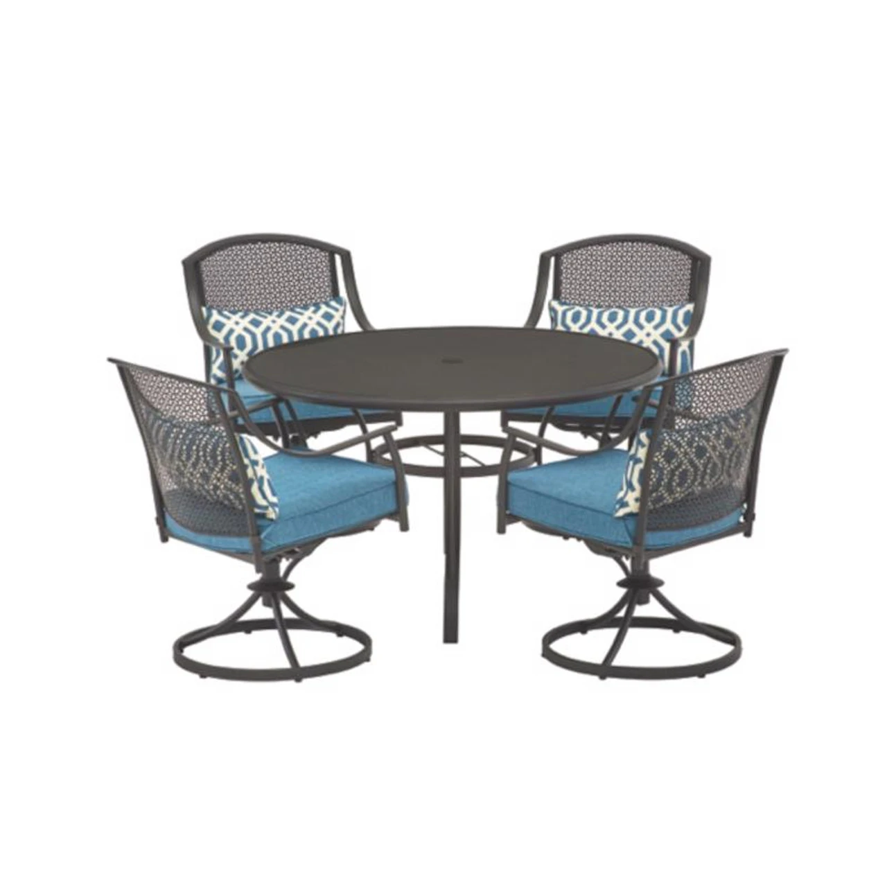 Bold styling set off by a striking contrast of colors gives this set an ultra-contemporary twist. Four swivel dining chairs feature a geometric design with peacock blue polyester cushions and festive lumbar pillows. The table is topped with smoked.