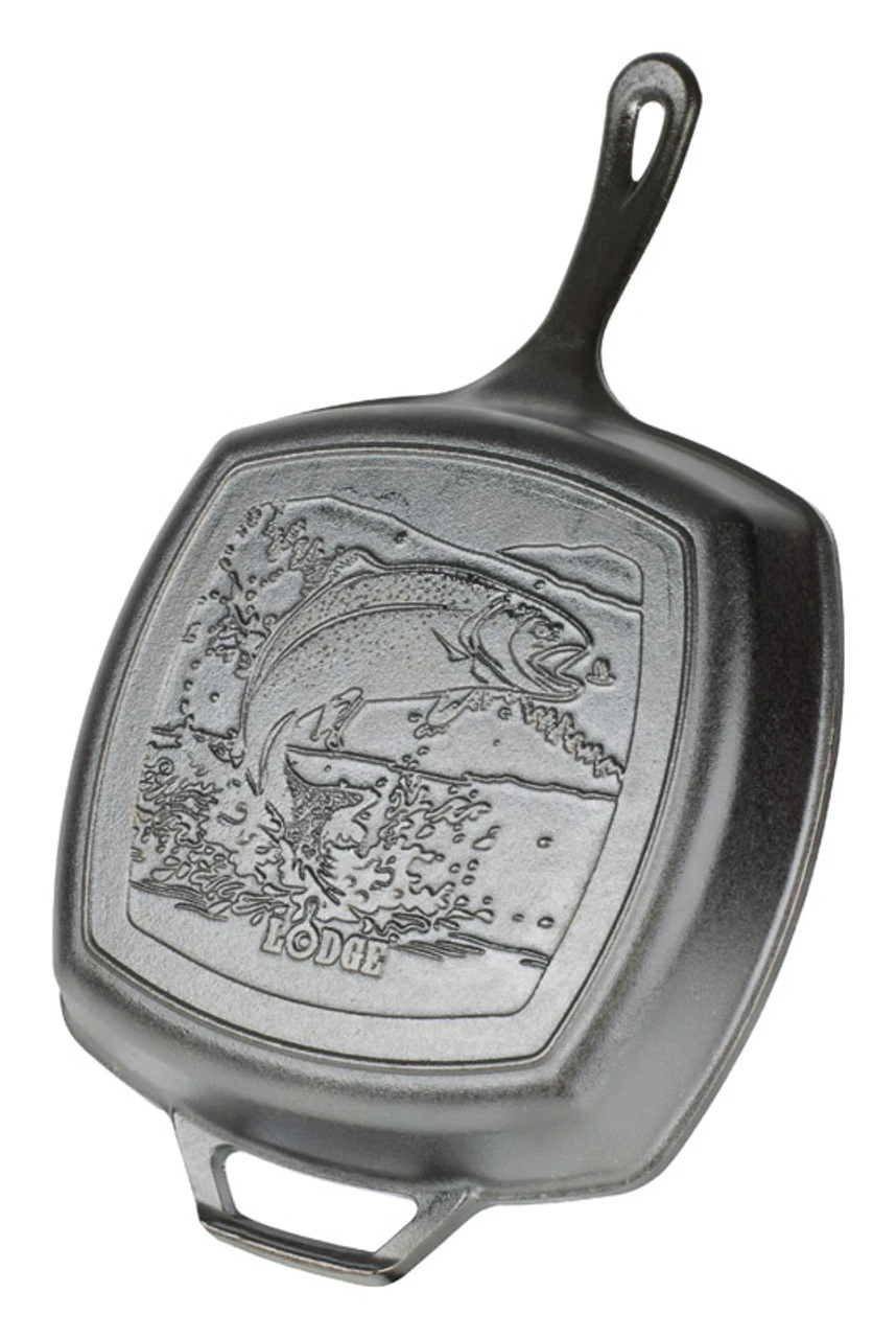 Lodge Wildlife Series cookware is made in the USA out of the highest quality cast iron and highlights some of America’s most distinctive animals. This 10.5 inch grill pan features a rainbow trout jumping after a fly.