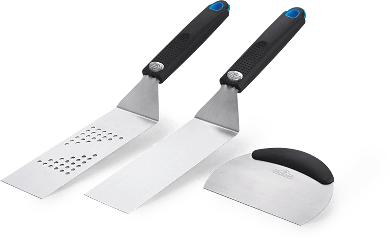 Try European style grilling with this Three-Piece Plancha Toolset, ideal for use with the Napoleon Planchas and Griddles. The oversized spatulas easily handle all types of food. The solid spatula with flexible design is perfect for rice, veggies, and seafood while the perforated spatula is ideal for burgers and fish. Use the chopper/scraper for easy dicing of a variety of foods, and quick cleaning and scraping of the griddle. The durable stainless steel construction with ergonomic handles means years of comfortable use.
