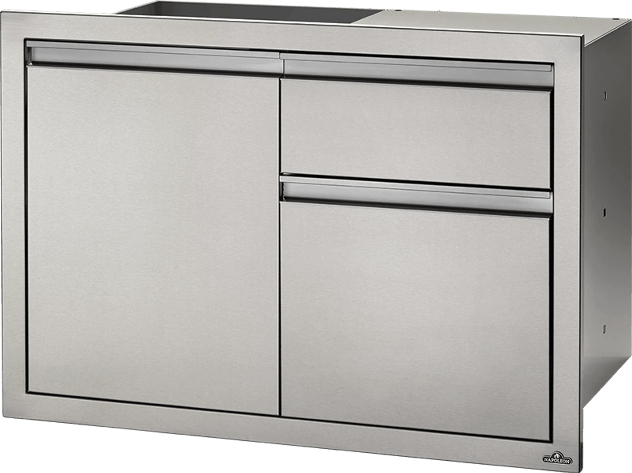 Creating your own custom grill island has never been easier with Napoleon’s Built-In Components. Every great outdoor kitchen needs storage; this 36″ x 24″ built-in component has everything you need for storage. Featuring a waste and recycling bin pull out, that can double as storage as well as a paper towel drawer, and a single large door for storage. The stainless steel construction, soft closing hardware, seamless trim, and anodized aluminum handles provide durability and endless installation possibilities.
