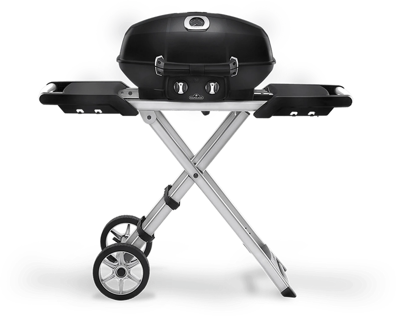 Napoleon’s TravelQ™ PRO285 Portable Propane Gas Grill with scissor cart can grill up to 20 hamburgers at once on the 285 square inches of cooking area. The stylish all-black finish with chrome details will match any outdoor decor. The cast aluminum, high-topped lid design lets you take portable grilling to the gourmet level. Roast whole chickens or turkeys, pork and even prime rib; this little grill can do it. Using the dual stainless steel burners, you have precise control over the temperature, just like on Napoleon’s full sized grills. High heat searing is a snap and you’ll know it’s a Napoleon with the iconic WAVE™ cooking grids for those distinctive sear marks. This grill has everything you need for perfect portable grilling anywhere, the nimble cart features all-terrain wheels, easy folding, setup, compact storage, and propane tank straps. This grill is perfect for any adventure. You can’t beat this professional grill in a portable package.