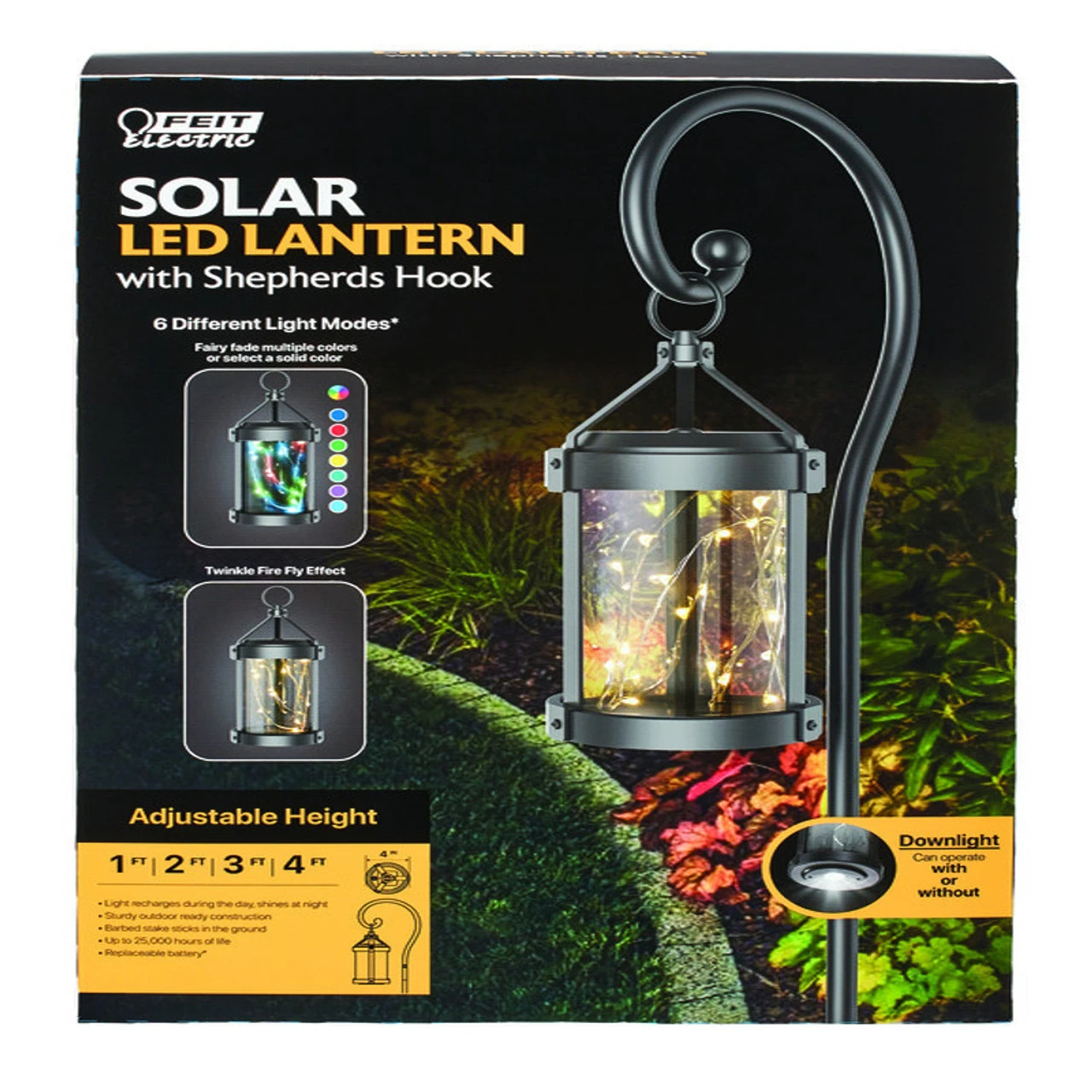 Add a touch of magic to outdoor spaces with this LED fairy light lantern from Feit Electric. Rechargeable and solar-powered, it can go to any part of the yard without worries about power plugs or cords, and recharge in as little as 6 hours on a sunny day. Hang from up to 4 feet from the ground with the included threaded pipe connectors, and turn the embedded LED downlight on whenever you need extra illumination. Choose a Soft White twinkle fire fly effect, transition between solid colors or fairy fade multiple colors at once. Durable and waterproof, this lantern can provide year-round festive light for your background or patio.