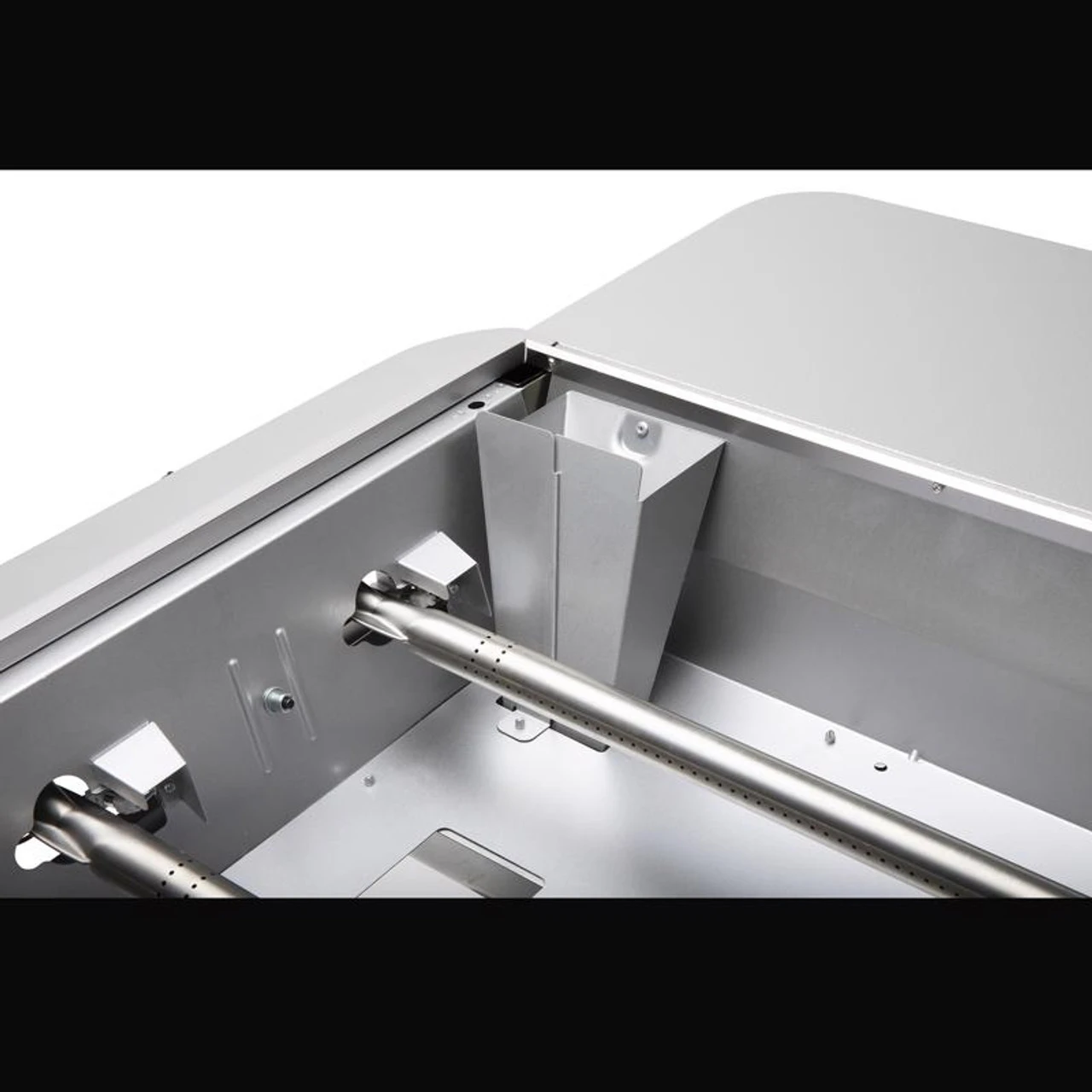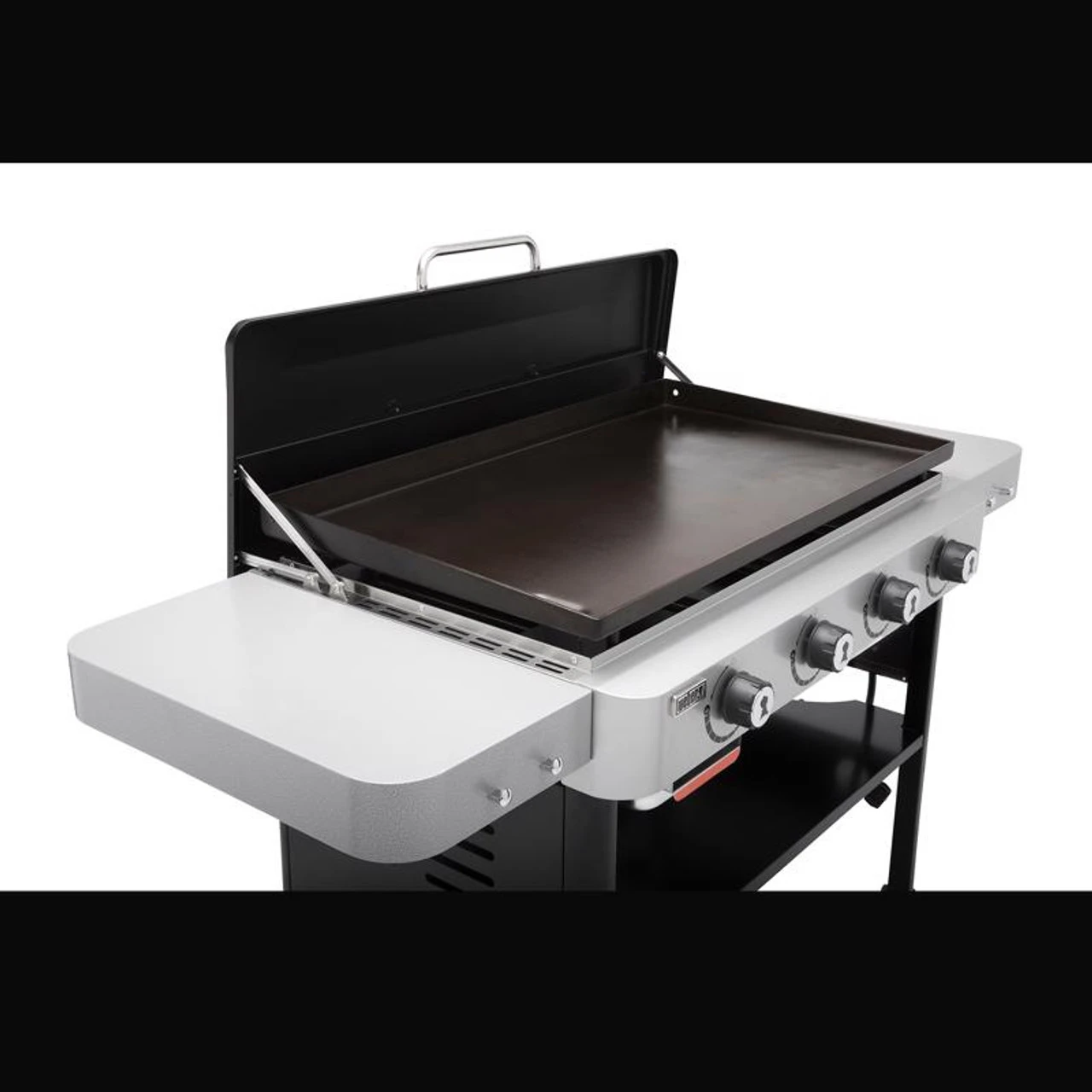The 36 in. carbon steel seamless griddle provides 756 square inches of cooking space and is designed to evenly distribute long-lasting heat. The four high-efficiency stainless steel burners provide 60,000 BTU that puts out heat in four different directions. The aluminized steel frame contains two work surfaces with tool hooks.