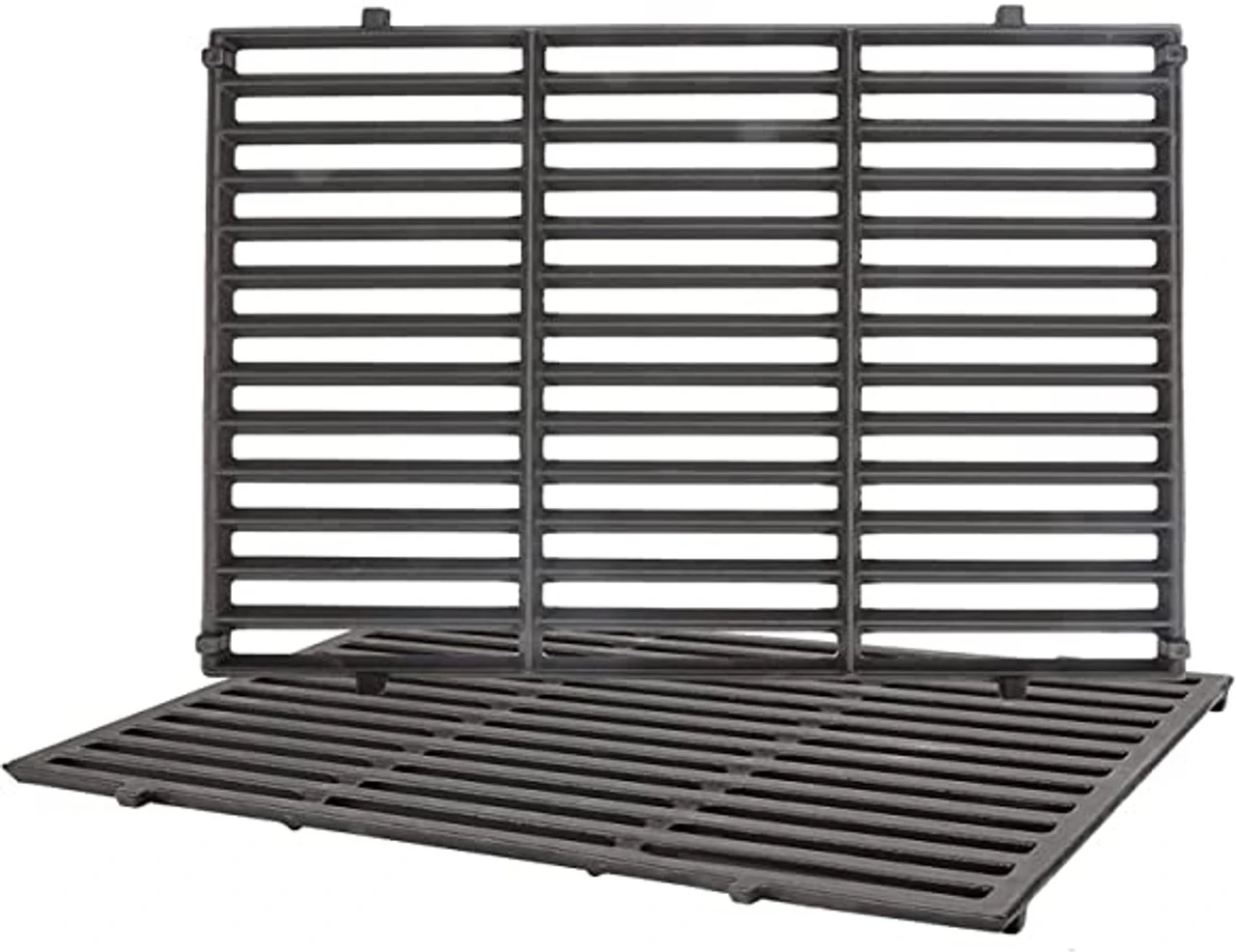 Two porcelain enameled cast iron cooking grates. Each piece measures 18-7/8″ front to back X 13-7/16″ wide, for a total set width of 26-7/8″. These grates are reversible, on one side the front to back rails are “peaked”, great for searing, and on the other side the rails are flat. Â Fits the Weber Genesis “II” 310 Series and many other brands/models.
